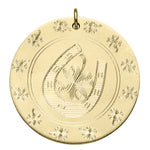 A classic gold disc engraved with beautifully detailed emblems using precision machine engraving. Custom motifs can be made.