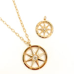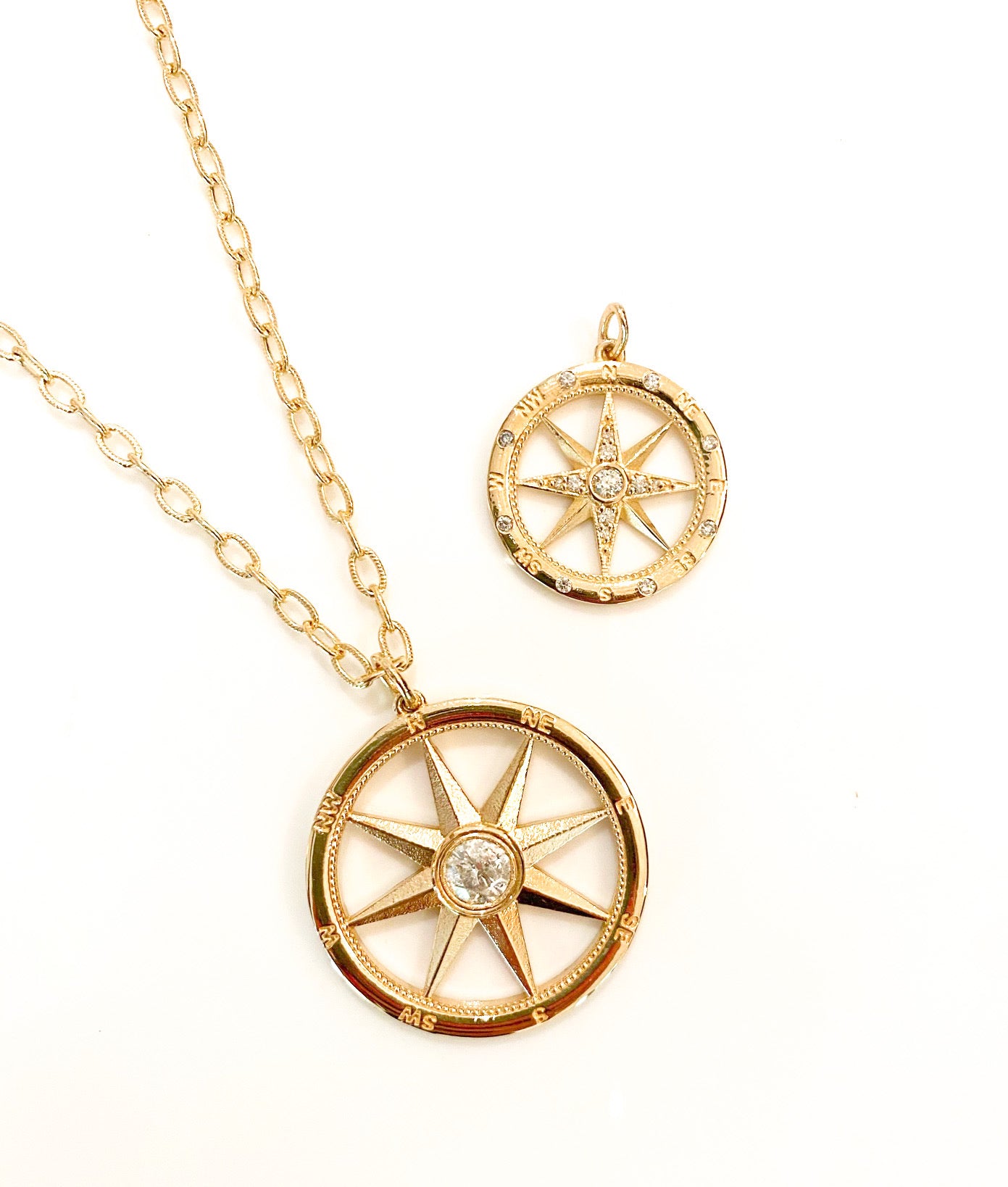 14k gold and white sapphire compass charm. 28mm. 5.5mm White Sapphire
