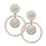 Radiant and playful, these statement earrings feature turquoise cabochons encircled by pink sapphires and white sapphires, all set in 14k gold. The double halo and open circle design shimmer with movement and color, offering a bold yet refined elegance.