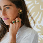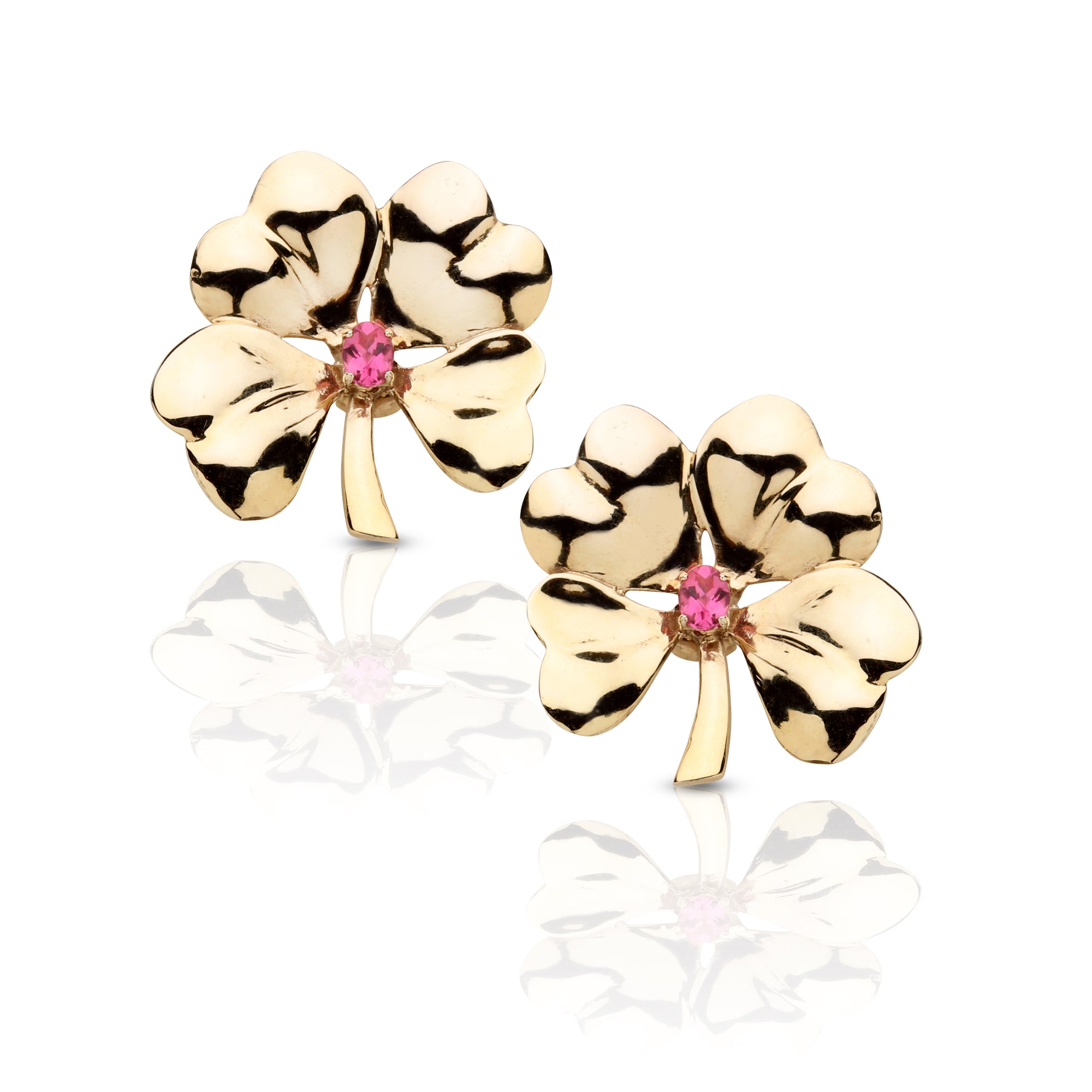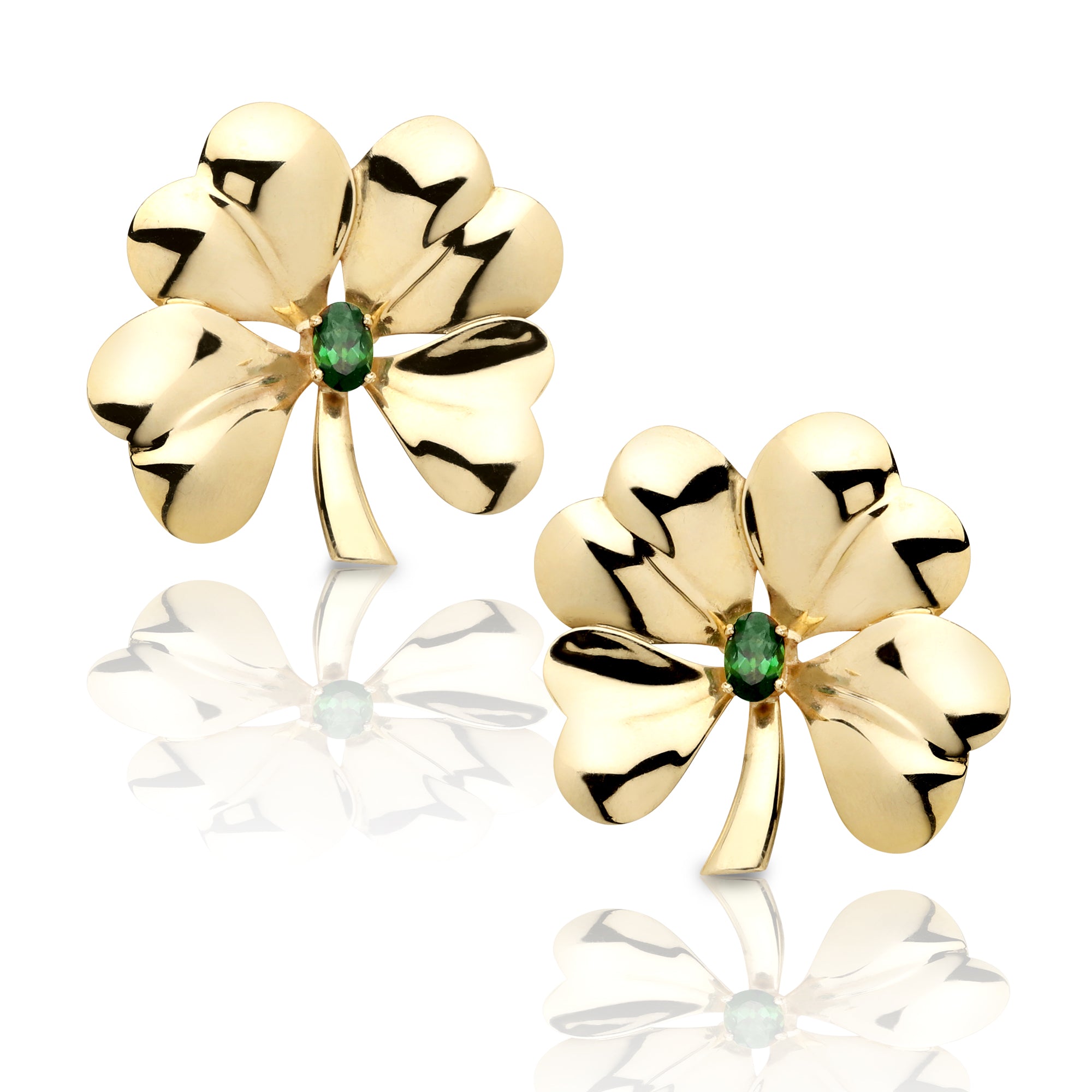 A modern take on a timeless symbol of luck. Each clover is centered with a green tourmaline stone. 14K yellow gold. Green tourmaline center. Post with omega back. 20.38 Grams