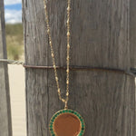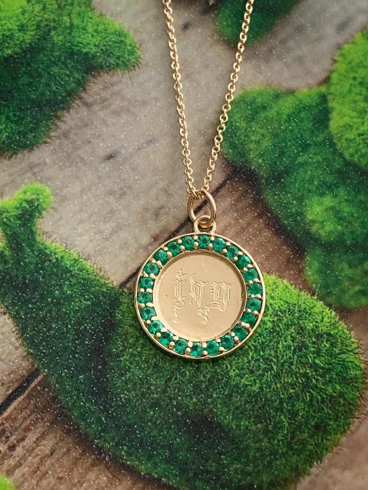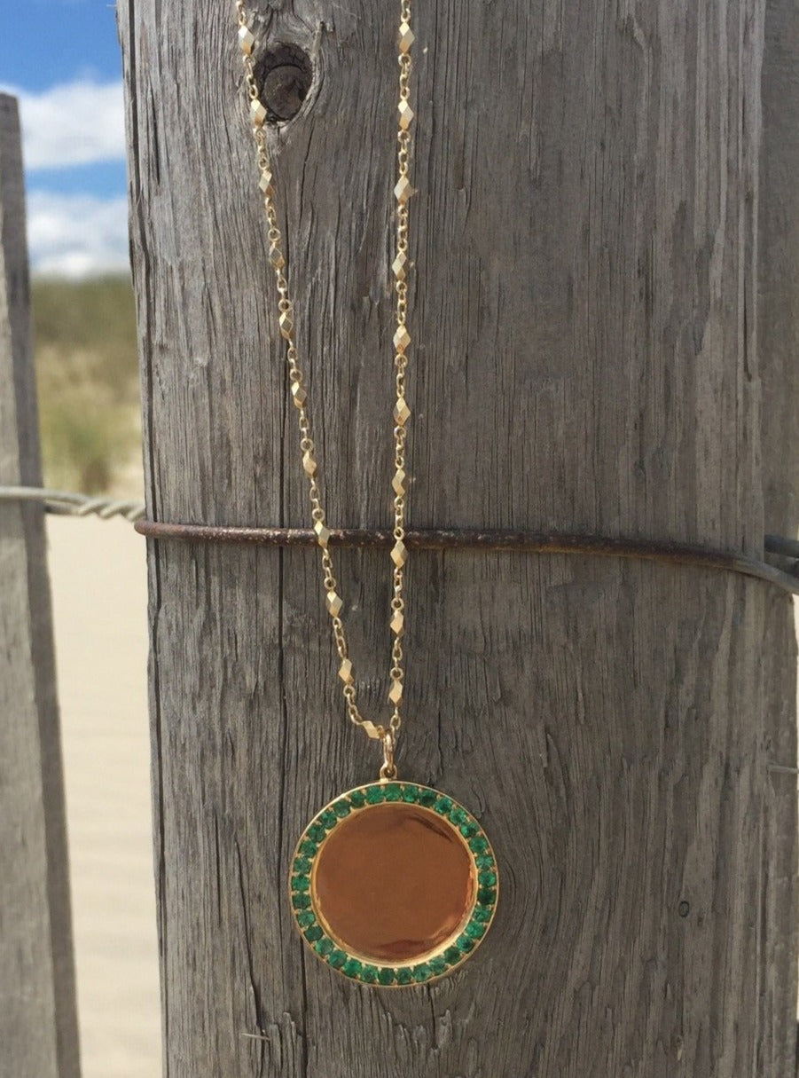 A timeless emerald disc pendant available in four sizes, designed for full customization. Add a monogram, name, date, or meaningful emblem-the possibilites are endless.