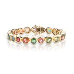 A luminous strand of bezel-set tourmalines in vibrant hues, crafted in 18k yellow gold. Elegant, timeless, and full of color. 27.06 18K 31.31 TCW