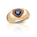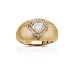 Gold dome ring featuring a heart-shaped stone framed by a halo of stones. Custom stone combinations available upon request.