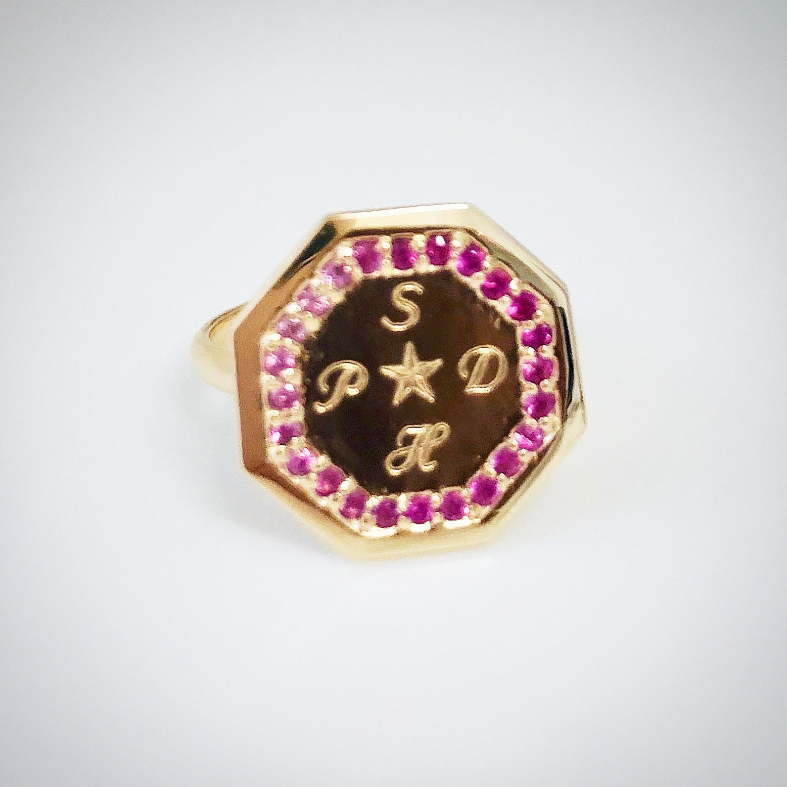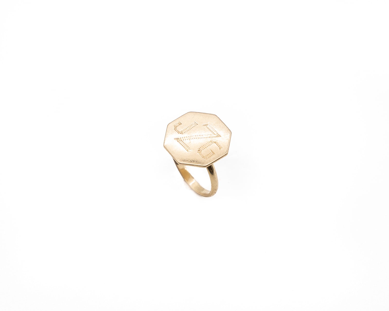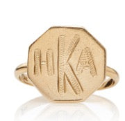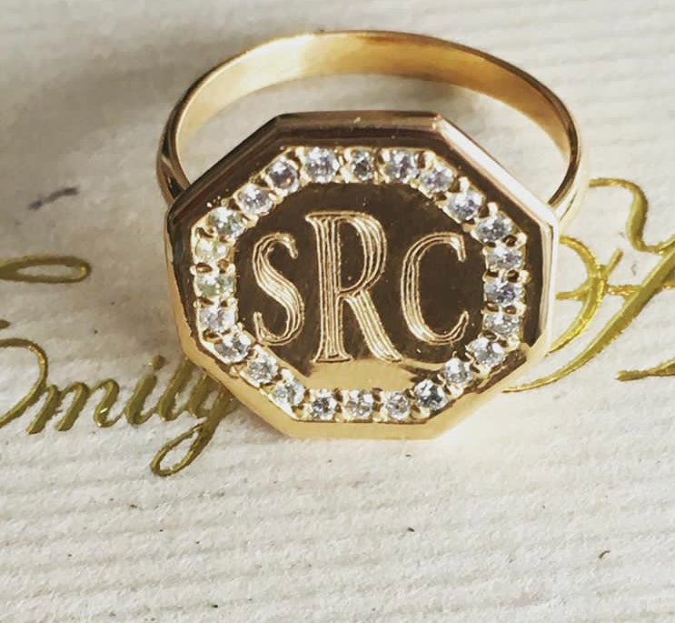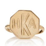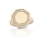 Contemporary 14k gold signet ring with an octagon shape framed in pave diamonds. A striking blend of geometric elegance and timeless luxury.